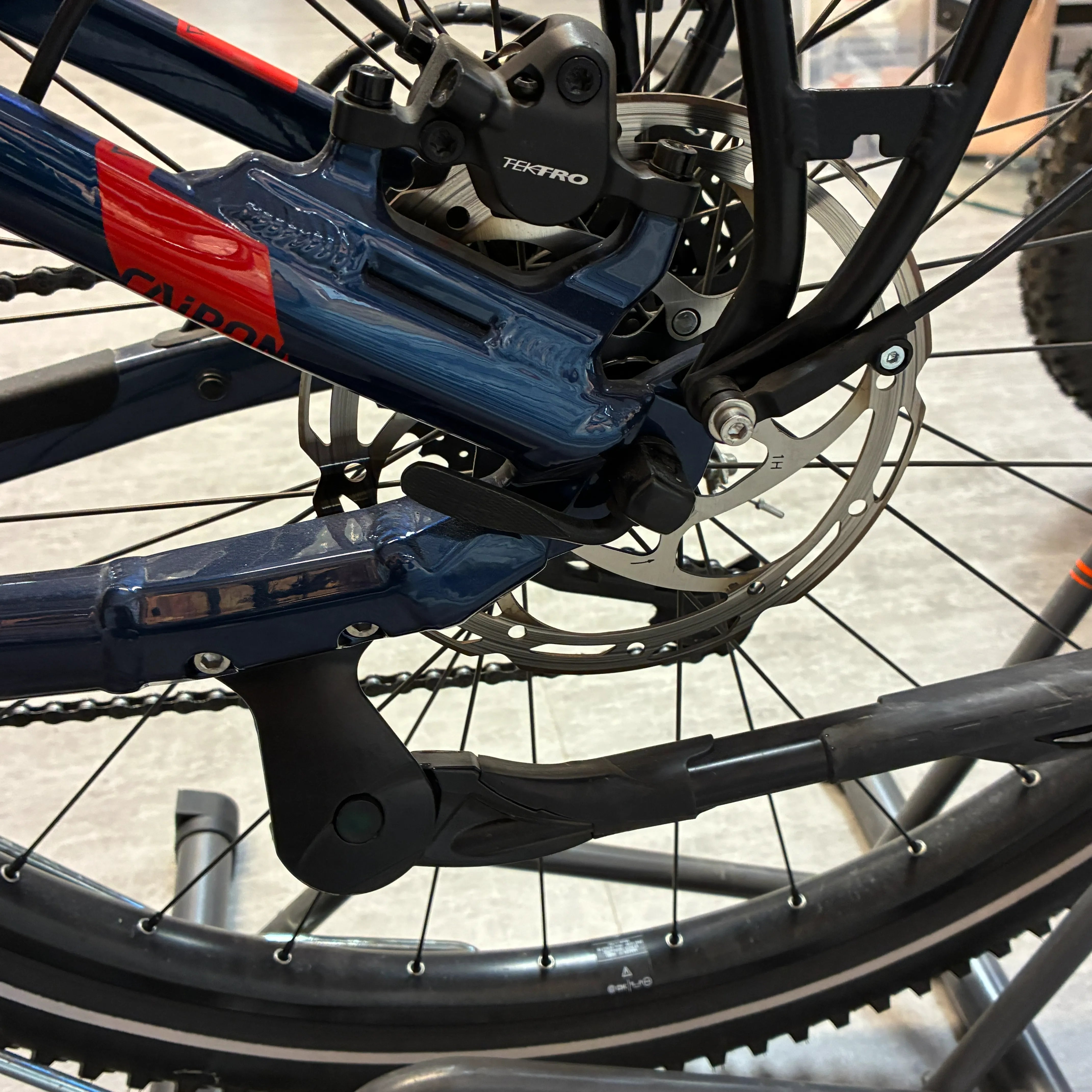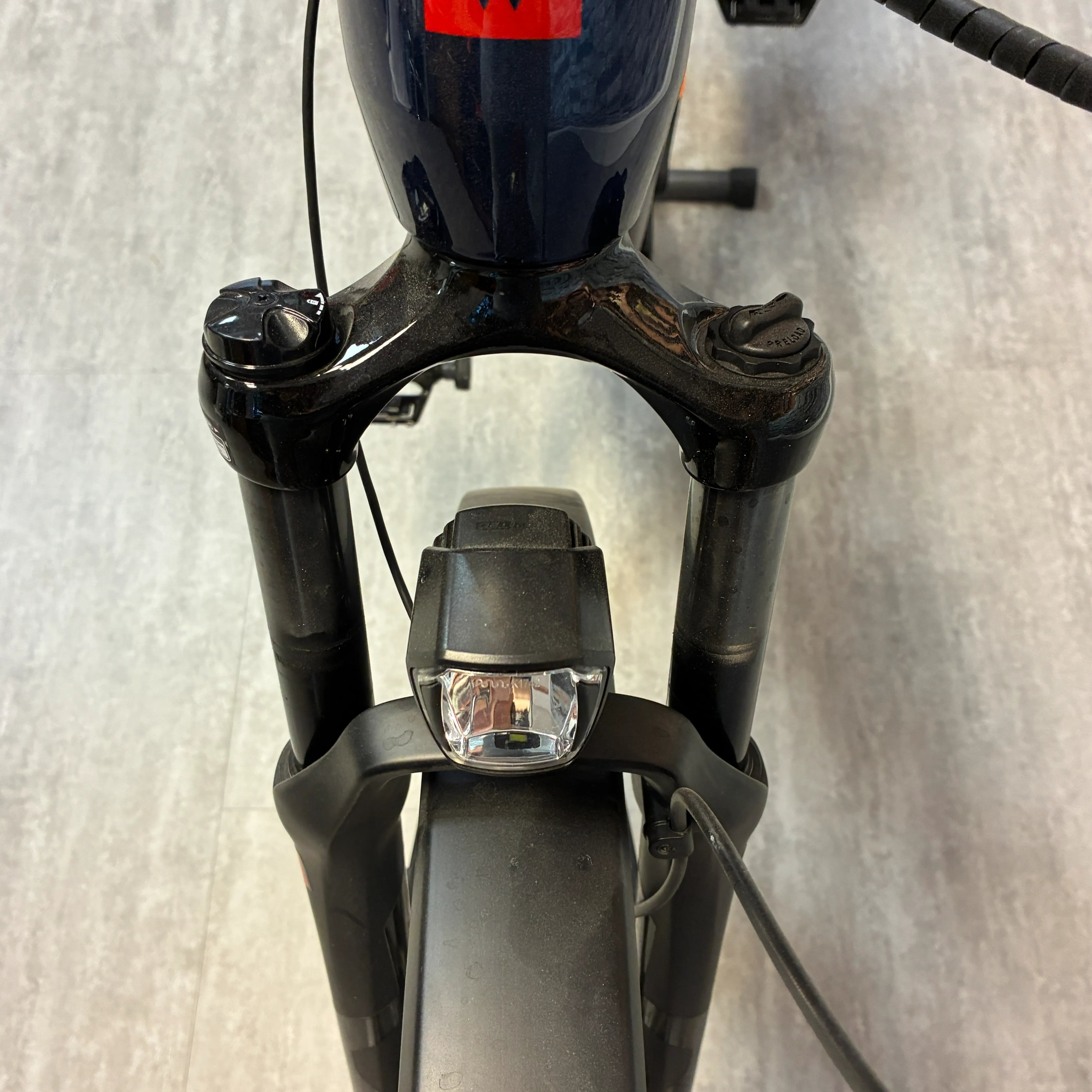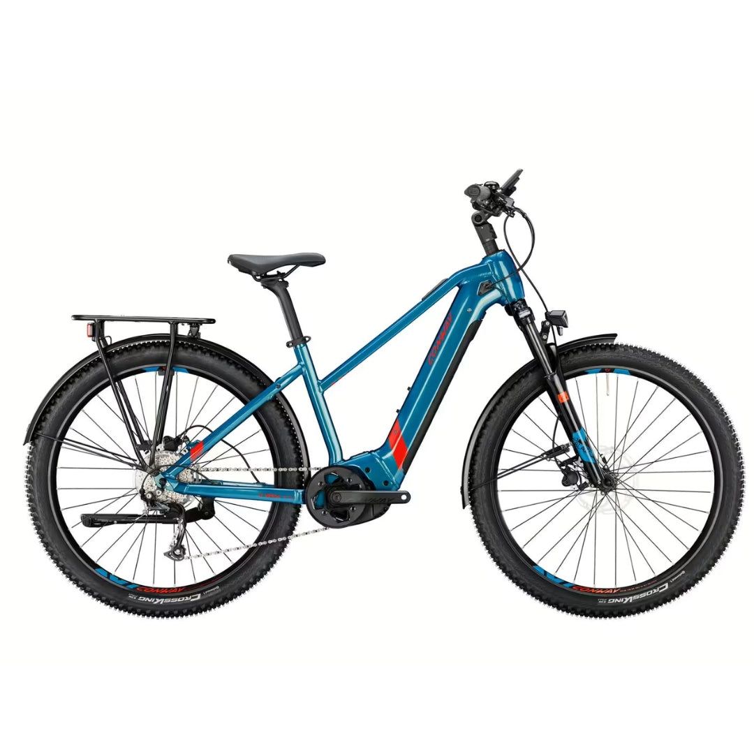 Zur Ausstattung gehören eine Federgabel mit 120 mm Federweg, eine Tektro EDRIVE 9 (1×9) Schaltung, hydraulische Scheibenbremsen und ein intuitives Bedienpanel mit Schiebehilfe.