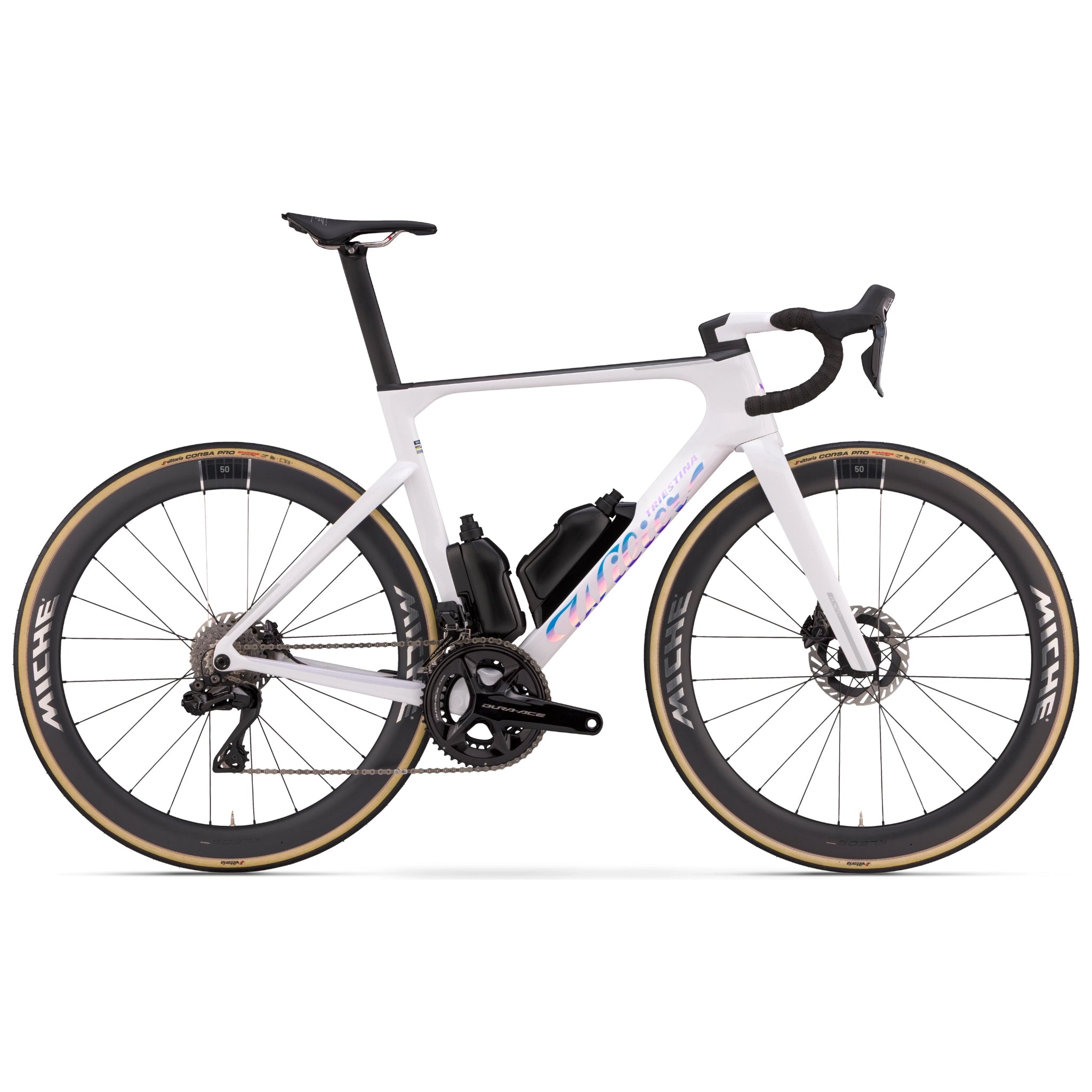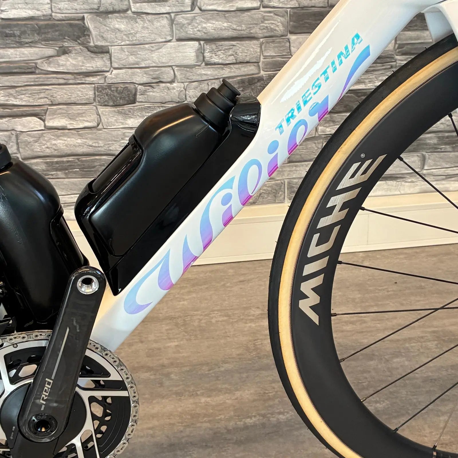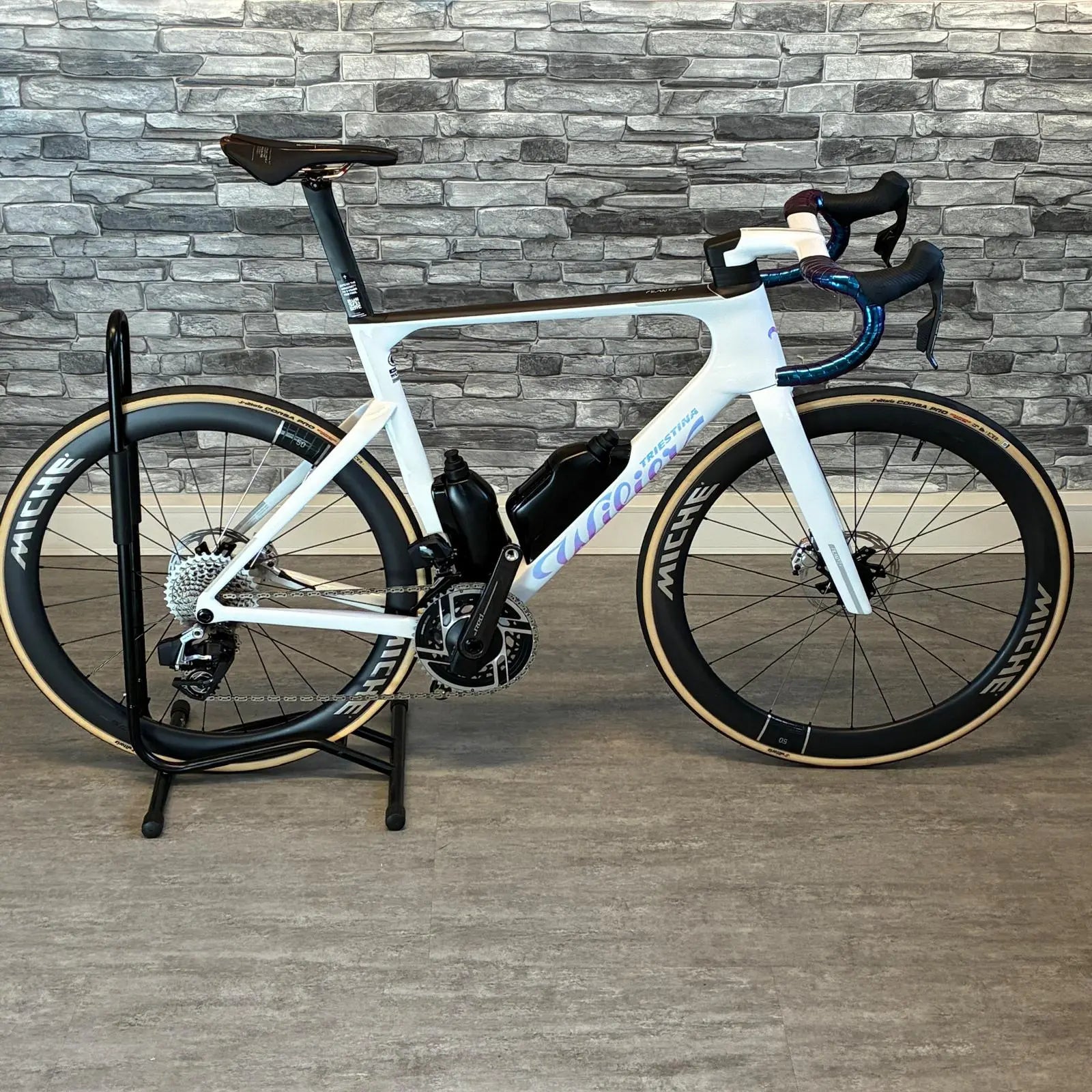 • Laufräder: Hochwertige Carbonräder, z. B. Miche Kleos RD 50 mm mit Premium-Lagerung.