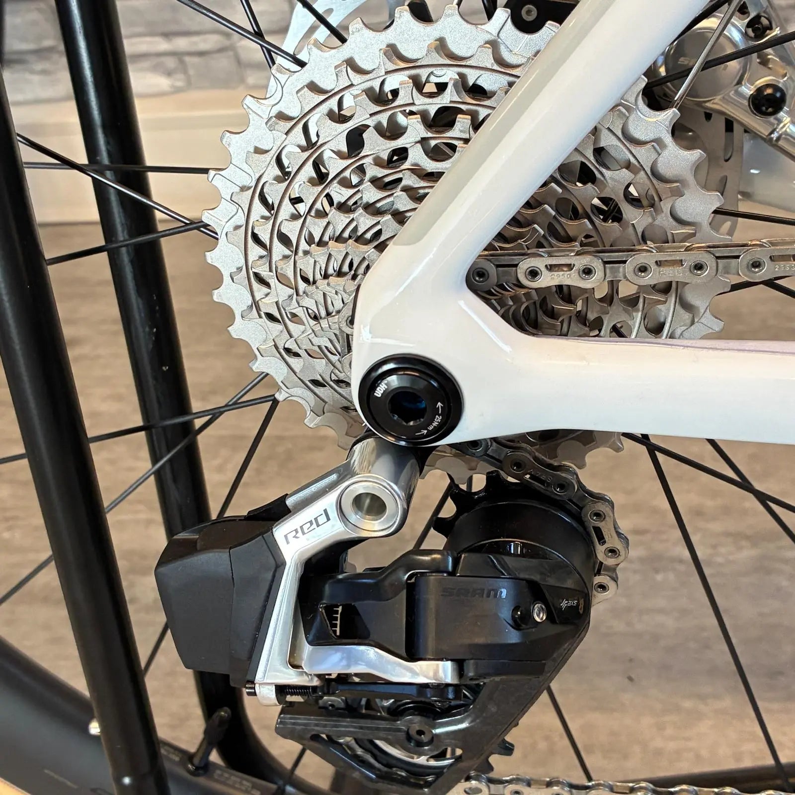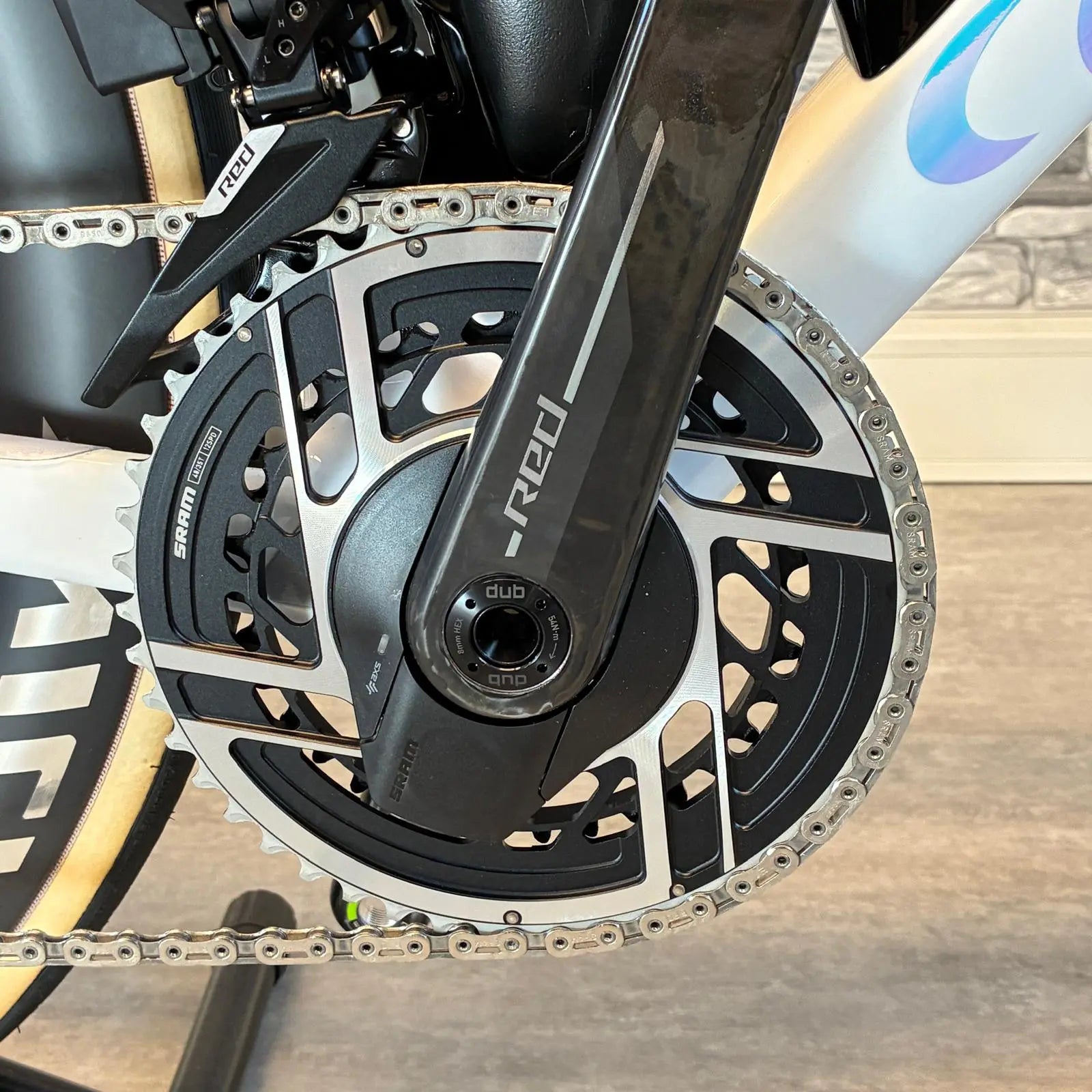 • Voll ausgestattete Elektronische Schaltung mit SRAM RED AXS E1 (2×12-Gänge), inklusive Power-Meter Option.